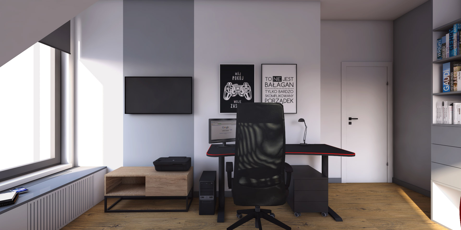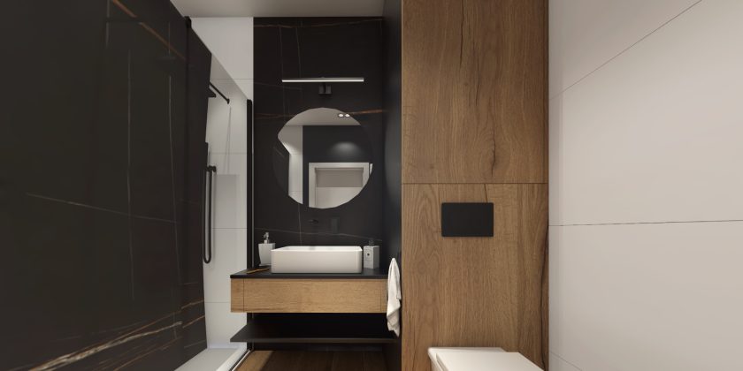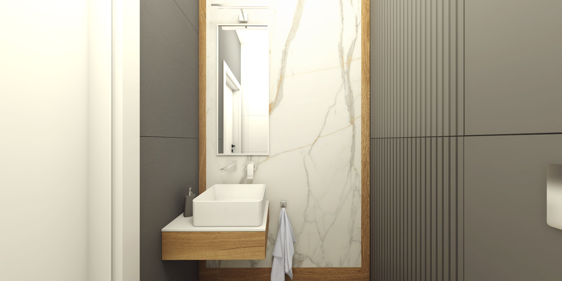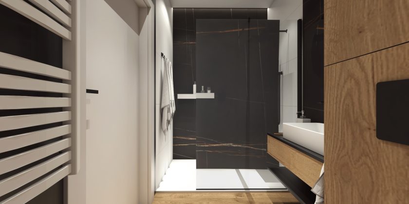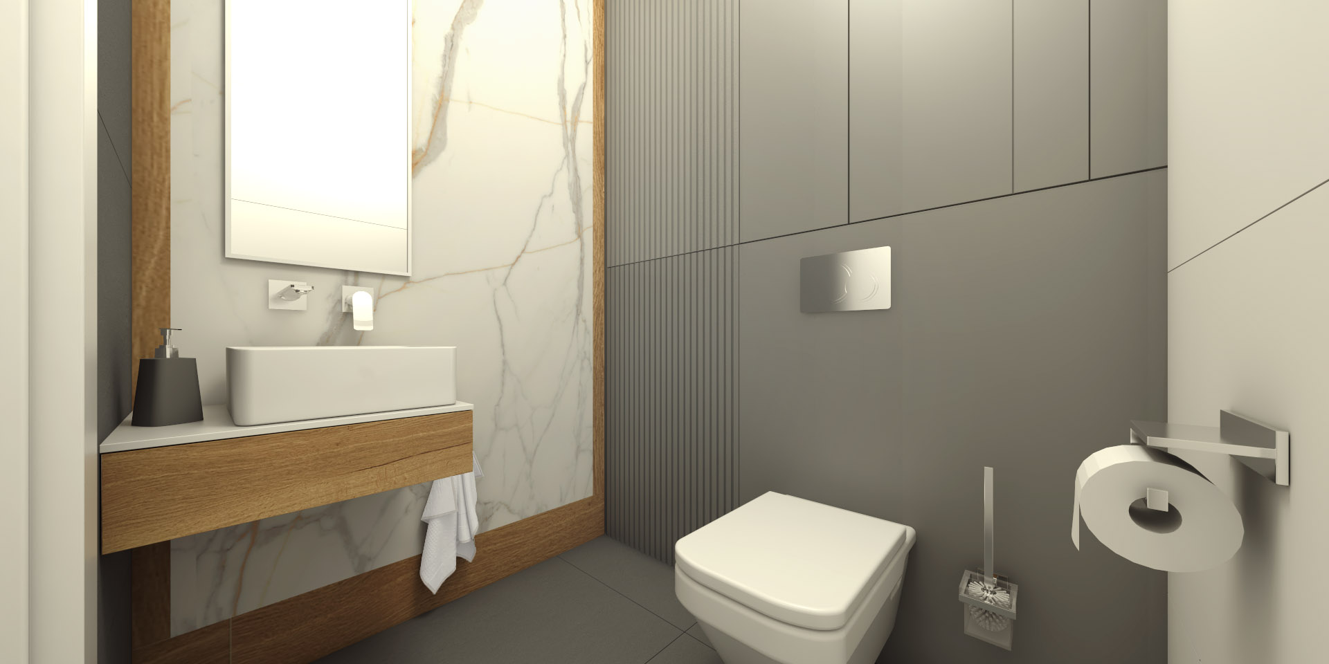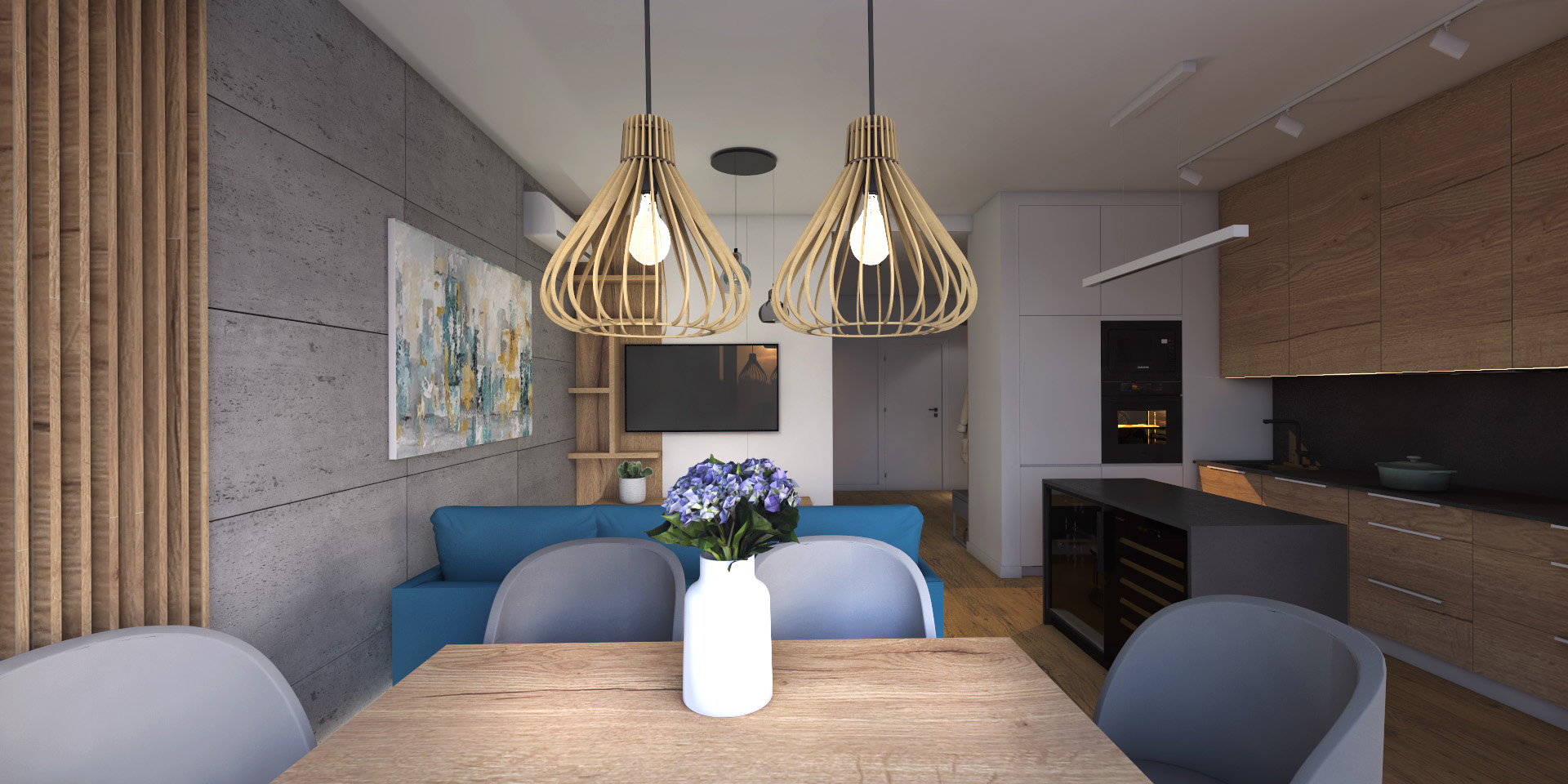 Elegancka przestrzeń, w której dominują ciepłe brązy, tworzy przytulny klimat, zachęcający do relaksu. Subtelne szare akcenty dodają wnętrzu nowoczesności i harmonii, podkreślając jego wyrafinowany styl.